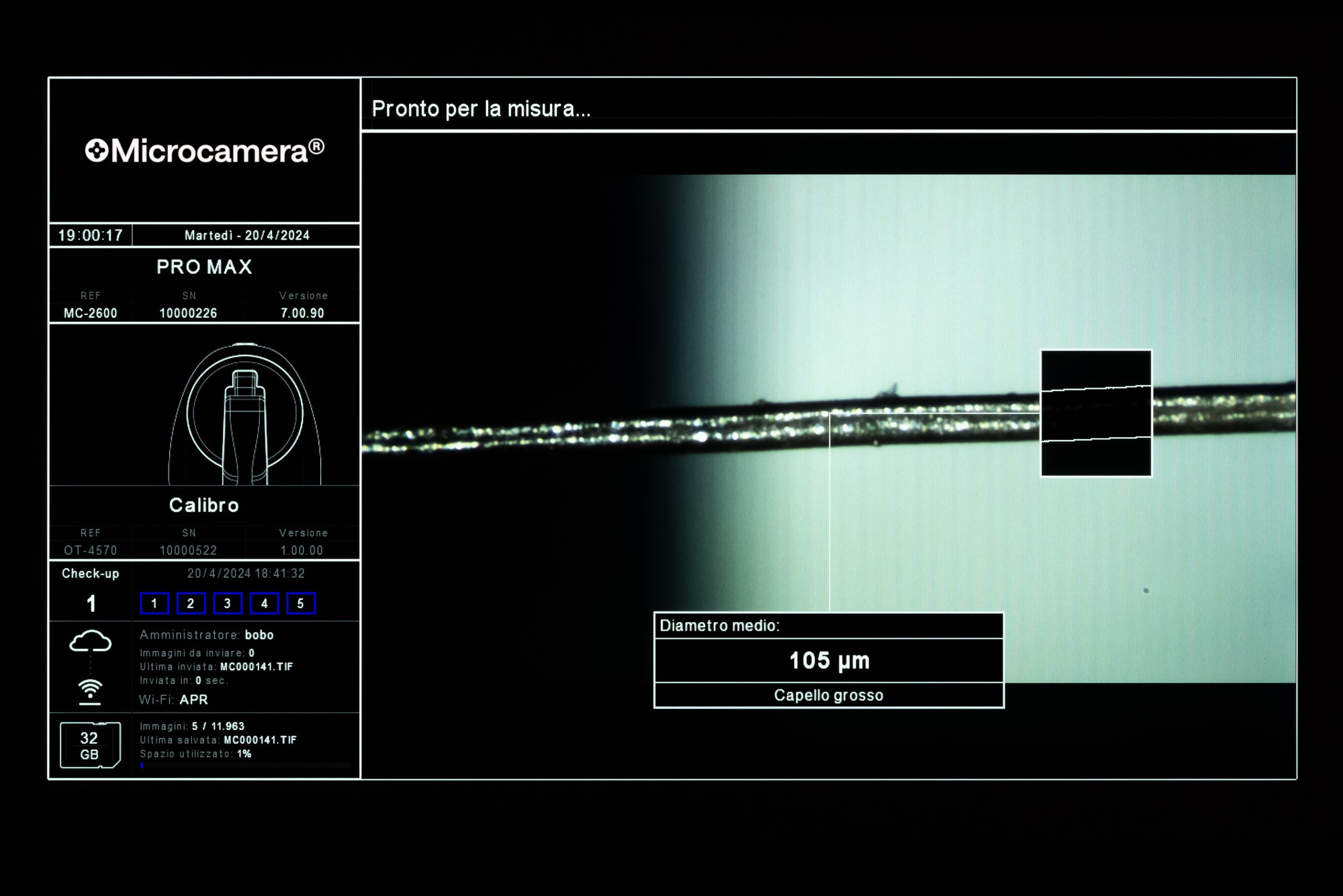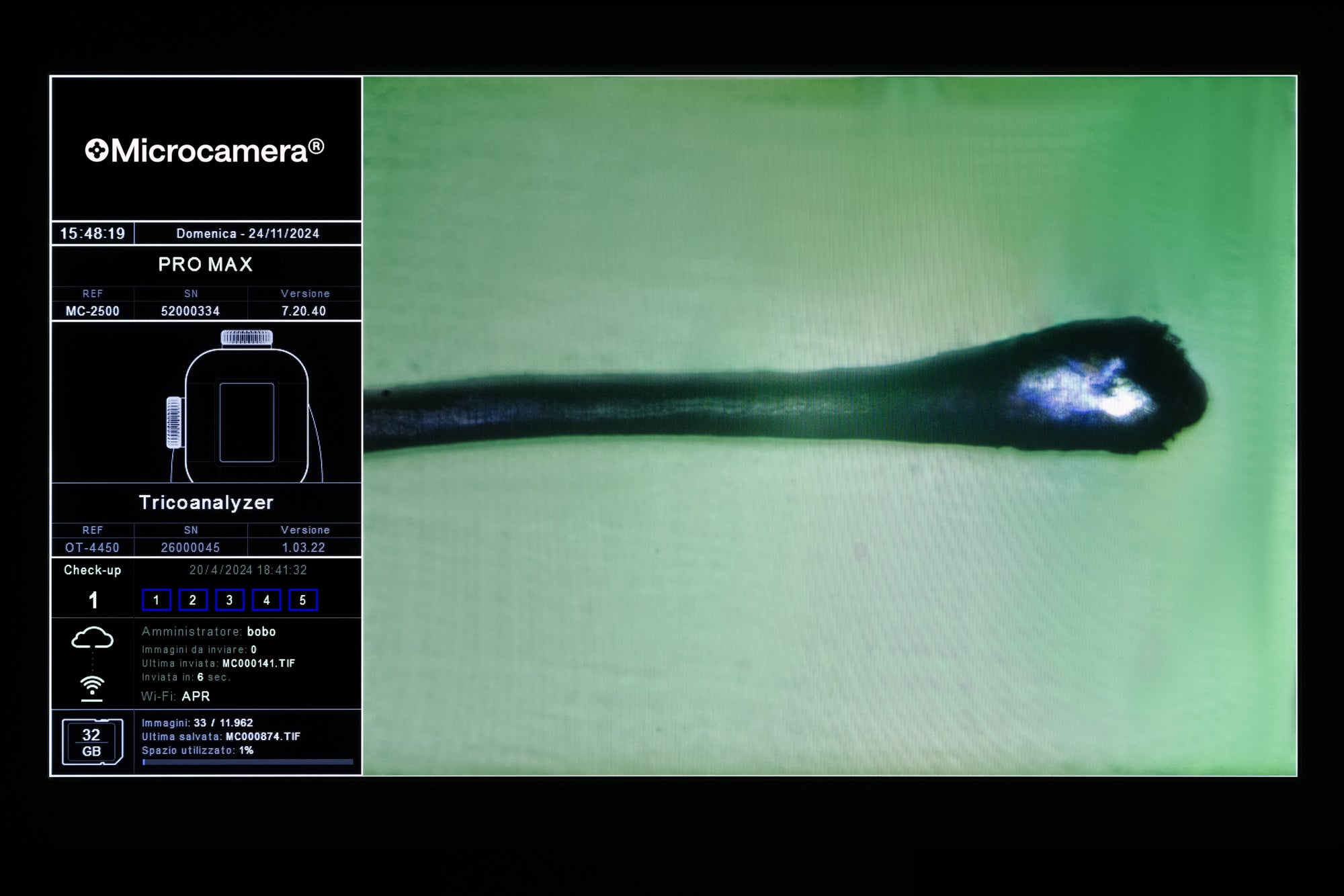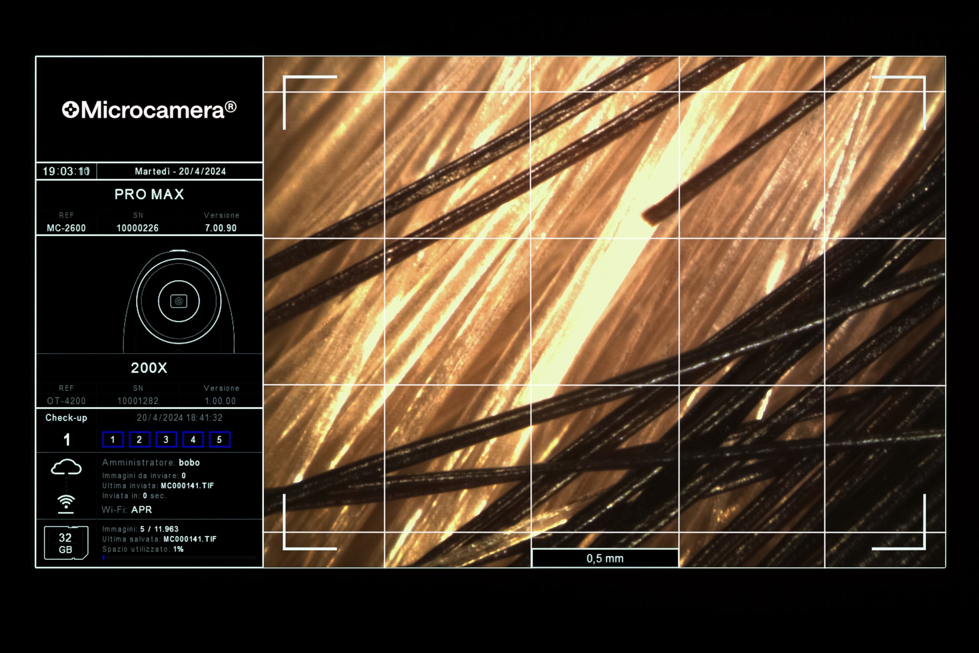 Microcamera® is a versatile instrument that with a single probe with integrated monitor accommodates multiple magnifying optics and measurement sensors. With our professional 200X and 400X lenses it is possible to analyze the structure of the hair, find split ends and check its length, up to checking the production of sebum, sebaceous plugs or miniaturized hair.